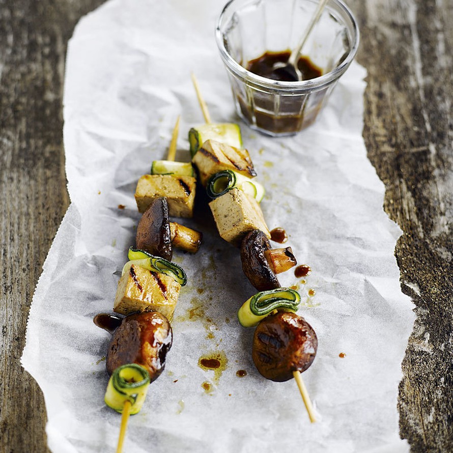 - Pujota kesäkurpitsarullat, tofukuutiot ja sienet vartaisiin. Grillaa 6–8 minuuttia grillipannulla tai uunissa grillivastuksen alla. Voitele grillaamisen aikana marinadilla.