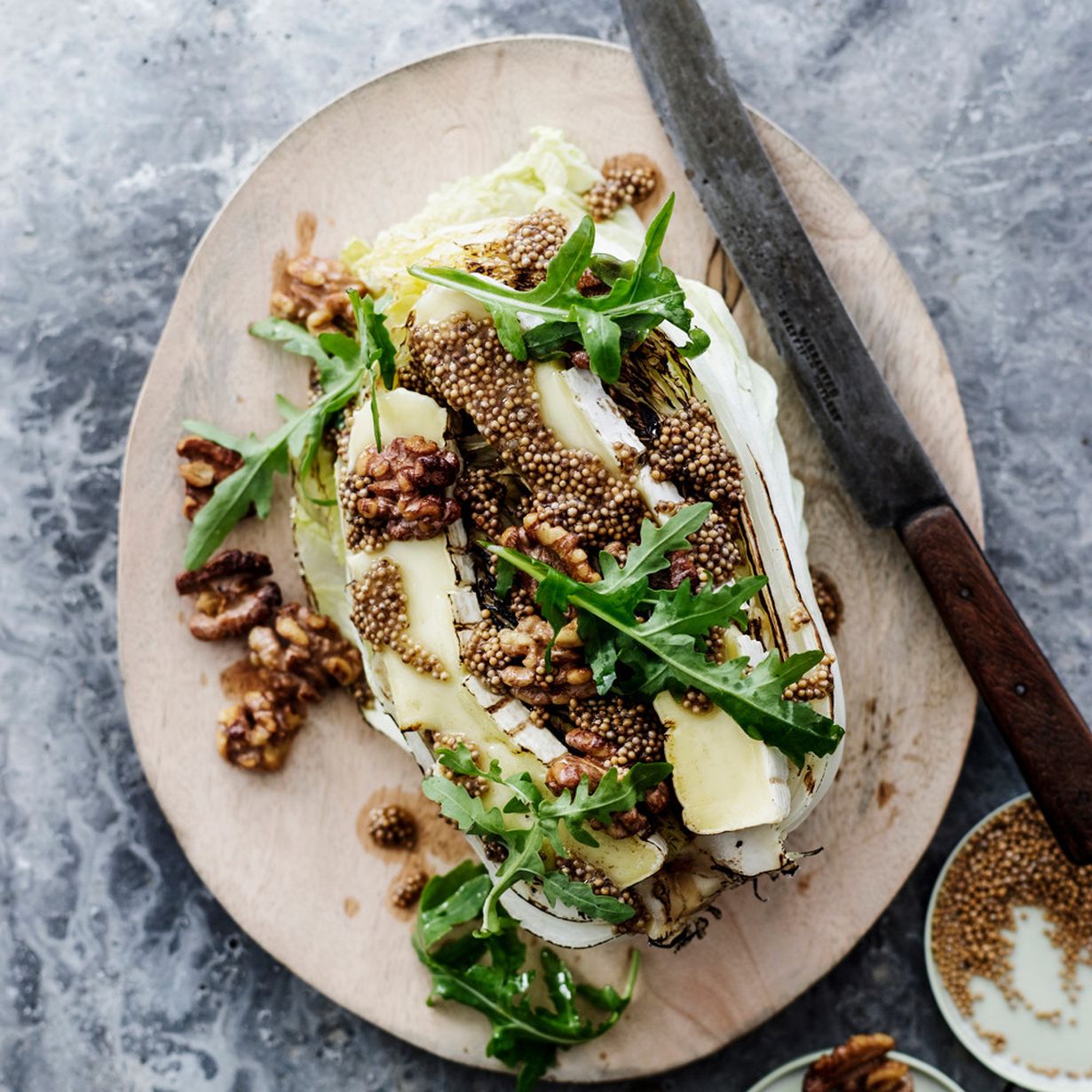 - Lämmitä vinegretti, nosta kaalinpuolikkaat vadille ja valuta vinegretti kaalin päälle. Viimeistele rucolalla, pähkinöillä, suolalla ja pippurilla.