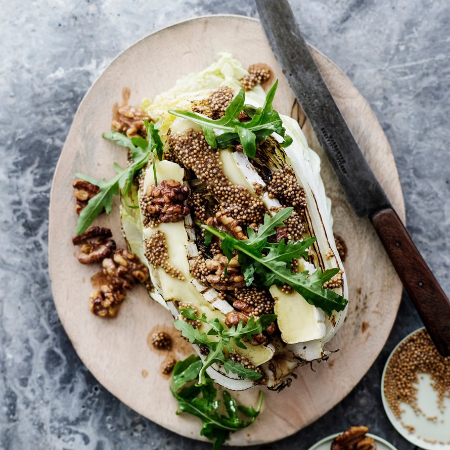 - Halkaise kiinankaali ja voitele oliiviöljyllä. Grillaa leikkuupintaa 5 minuuttia, käännä ja grillaa kuperaa puolta 5 minuuttia, varo ettei kaali pala. Viipaloi briejuusto ja laita viipaleet grillauksen loppuvaiheessa kaalin päälle lämpenemään.