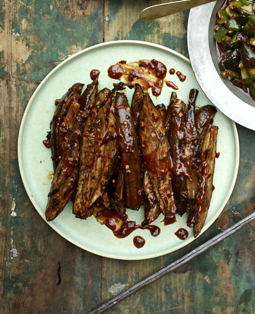 Iske grilliin munakoisot ja päälle herkullinen kastike, joka muodostuu maapähkinävoista, seesamiöljystä ja rapeasta chilitahnasta.