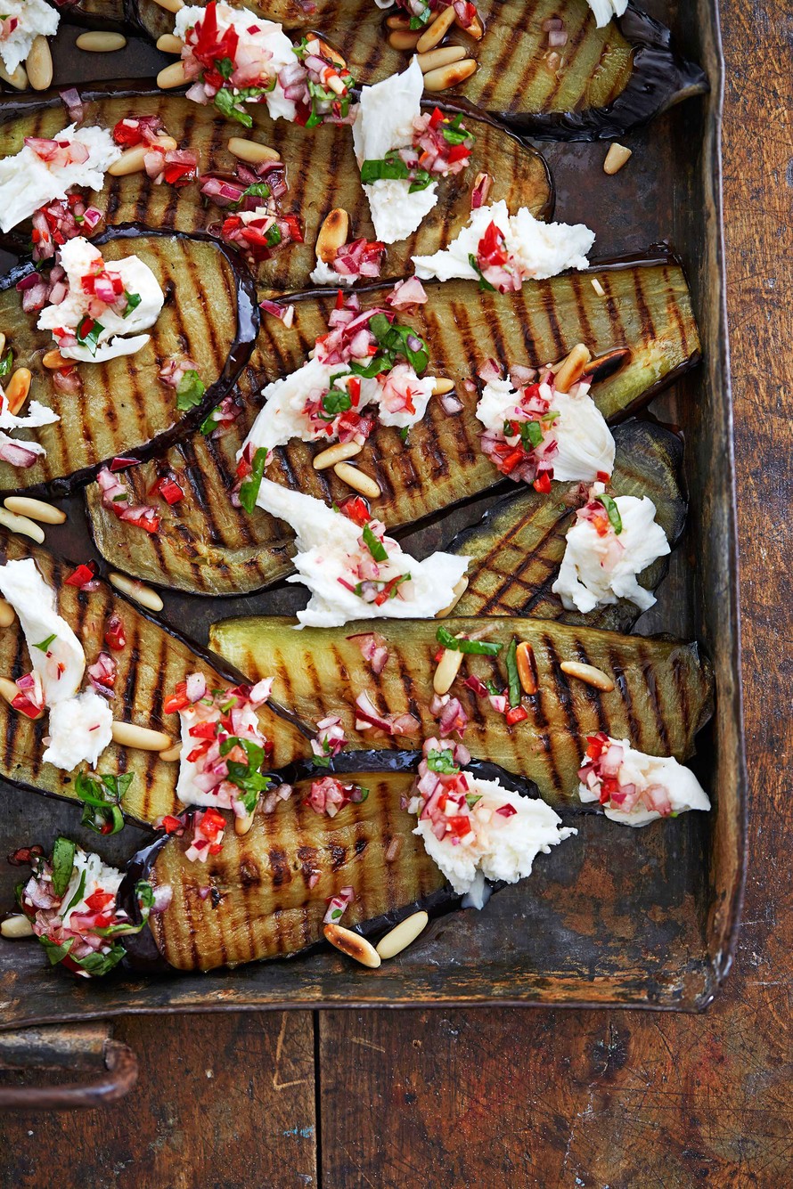 - Tee kastike. Kuori punasipuli ja hienonna. Halkaise chili, kopauta siemenet pois ja hienonna. Sekoita punaviinietikan joukkoon hunaja, öljy, punasipuli, chili, hienonnettu valkosipuli ja lehtipersilja. Lusikoi kastiketta munakoisojen ja mozzarellan päälle.