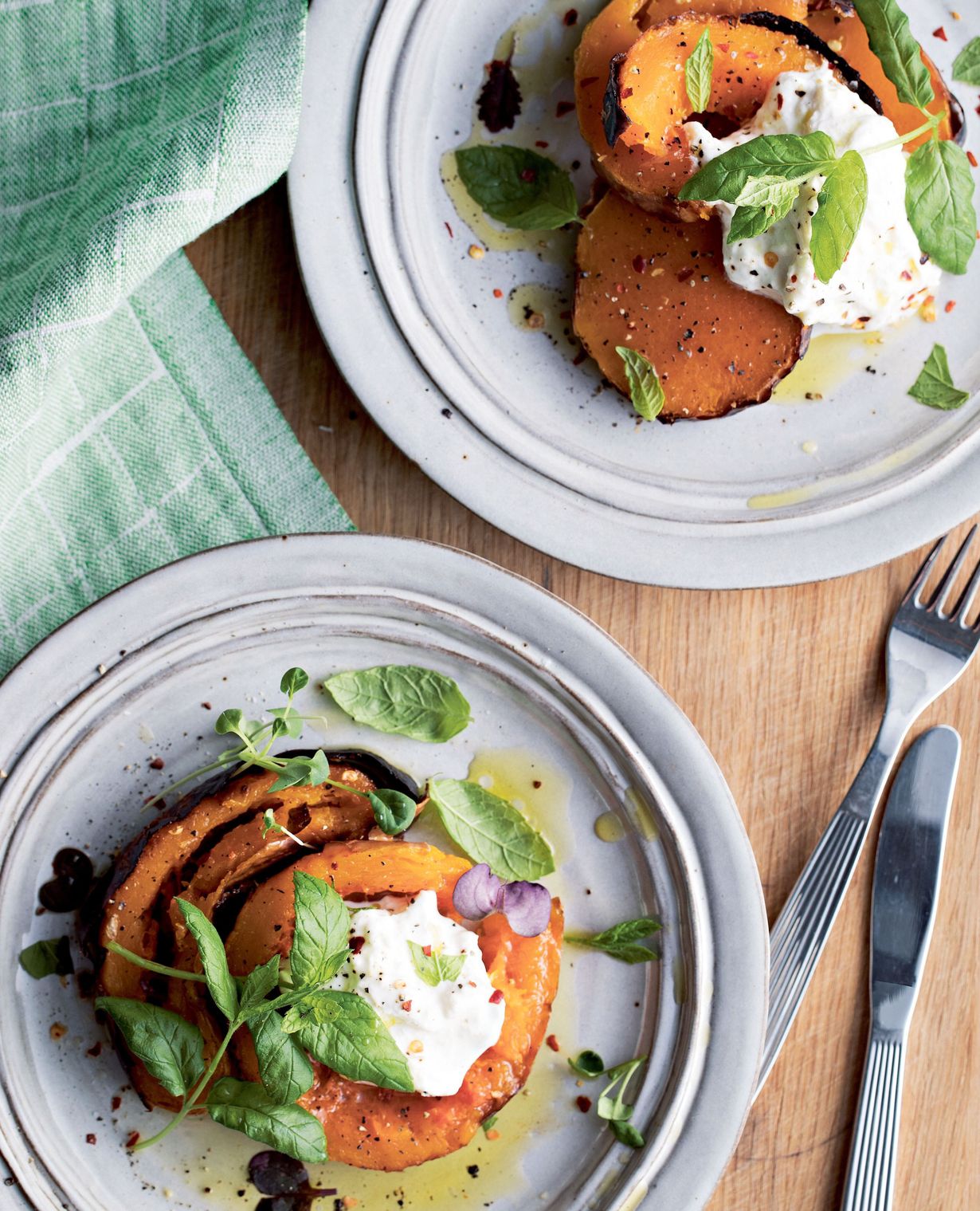 - Laita kurpitsaviipaleet vadille ja purista niille toisen limetin mehu. Valuta noin puolet oliiviöljystä kurpitsoille. Mausta suolalla, pippurilla ja chilirouheella. Revi burrata ja mintunlehdet päälle. Valuta loppu öljy ja purista toisen limetin mehu pinnalle. Mausta halutessasi vielä suolalla ja pippurilla.