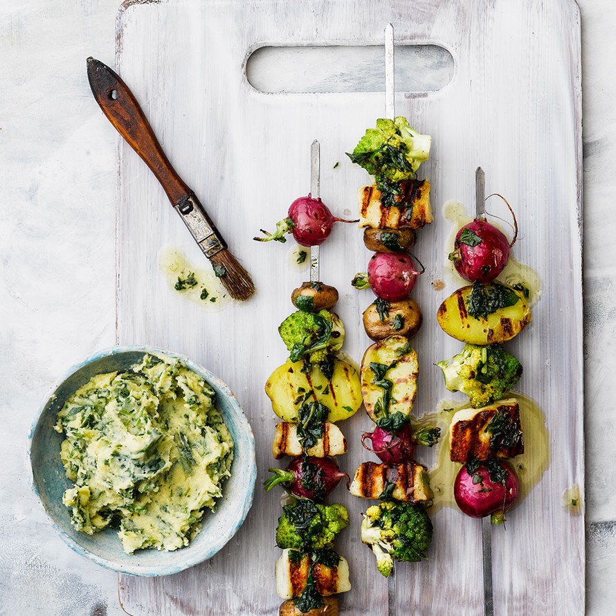 Kasvisvartaat tarvitsevat aikaa, jotta palat kypsyvät tasaisesti. Samalla kun vartaat kypsyvät, voit valmistaa elämäsi parhaan maustevoin ruskistetusta voista ja retiisinnaateista.