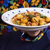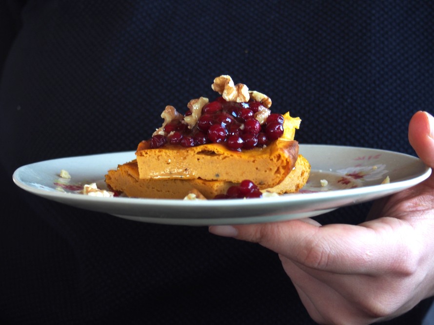 - Lämmitä uuni 200 asteeseen. Kuori kurpitsa(t) ja leikkaa pituussuunnassa kahtia. Koverra siemenet pois ja laita kurpitsa uuniin paahtumaan. Paahda, kunnes kurpitsa on pehmeää. Nosta kurpitsa jäähtymään. Laske uunin lämpötila 175 asteeseen.
