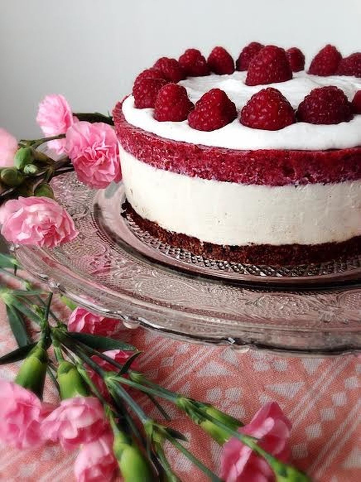 Soseuta tehosekoittimella tai sauvasekoittimella marjakreemi ja anna turvota noin kymmenisen minuuttia ennen kuin kaadat seoksen kakun päälle. Anna koko kakun jähmettyä pakkasessa ainakin pari tuntia. Irrota vuoasta ja laita kauniisti tarjolle. Muista koristella mielesi mukaan! Itse tykkäsin tällä kertaa vaahdottaa jääkaappikylmää Kara-kookoskermaa, jonka maustoin hunajalla ja vaniljajauheella. Laitoin myös tuoreita vadelmia ja join kuuman kaakaon kaverina. Nam!