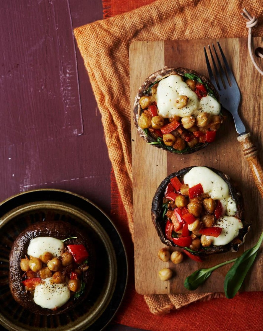 - Täytä sienilakit tuoreilla pinaatinlehdillä ja kikherneseoksella. Kypsennä sieniä 200-asteisessa uunissa 20 minuuttia. Ota sienet uunista ja revi päälle mozzarellaa. Jatka kypsennystä vielä noin 5 minuuttia, kunnes juusto on sulanut sienten pinnalla.