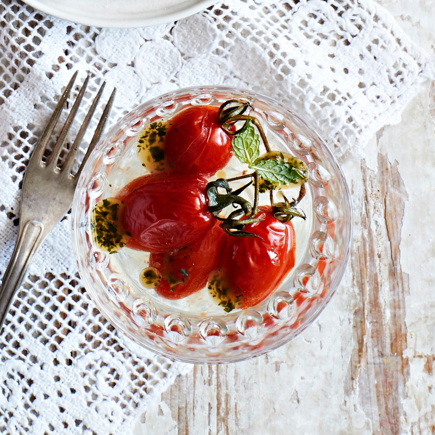 Mintulla maustetut, kevyesti savuiset kirsikkatomaatit ja herkkä, viileä tomaattiliemi ovat yksinkertaisuudessaan upea alkuruoka.