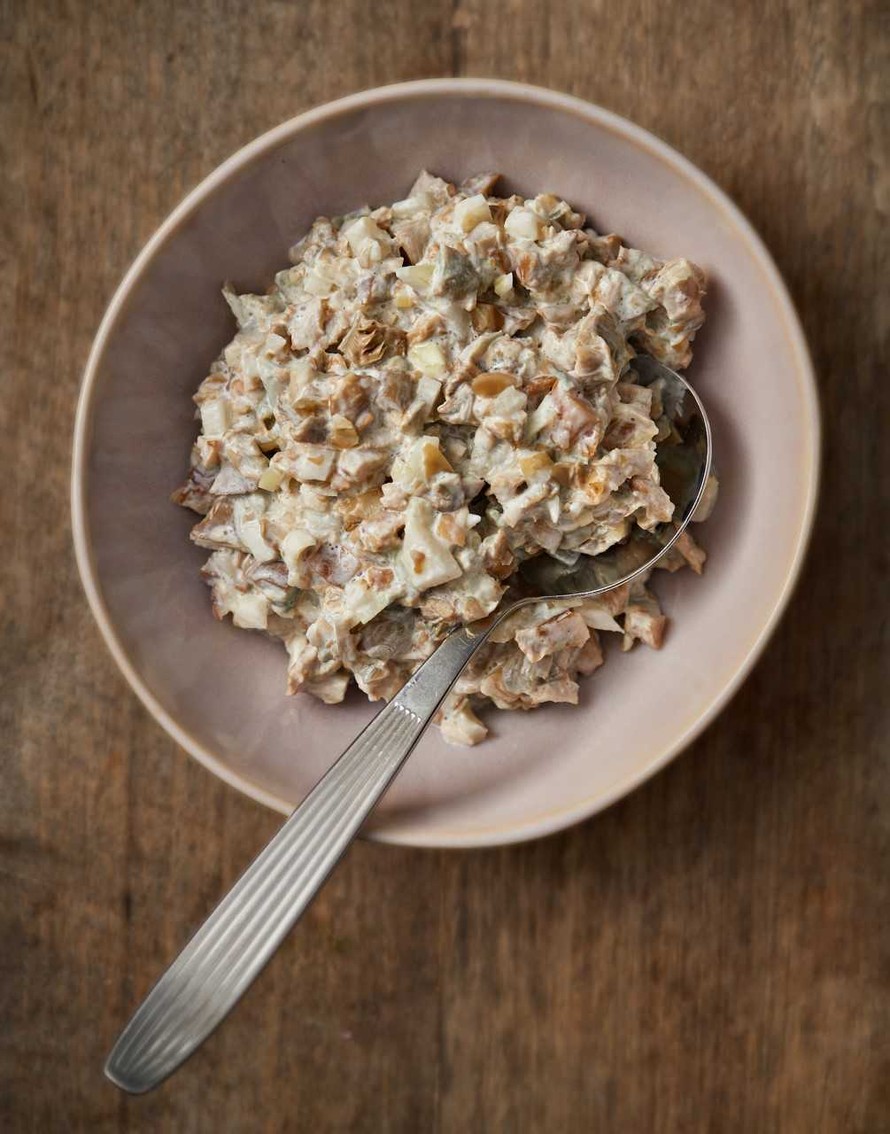 - Vatkaa kerma löysäksi vaahdoksi ja yhdistä kaikki aineet. Sienisalaatti on parhaimmillaan, kun annat makujen tasaantua jääkaapissa vähintään 15 minuuttia.
