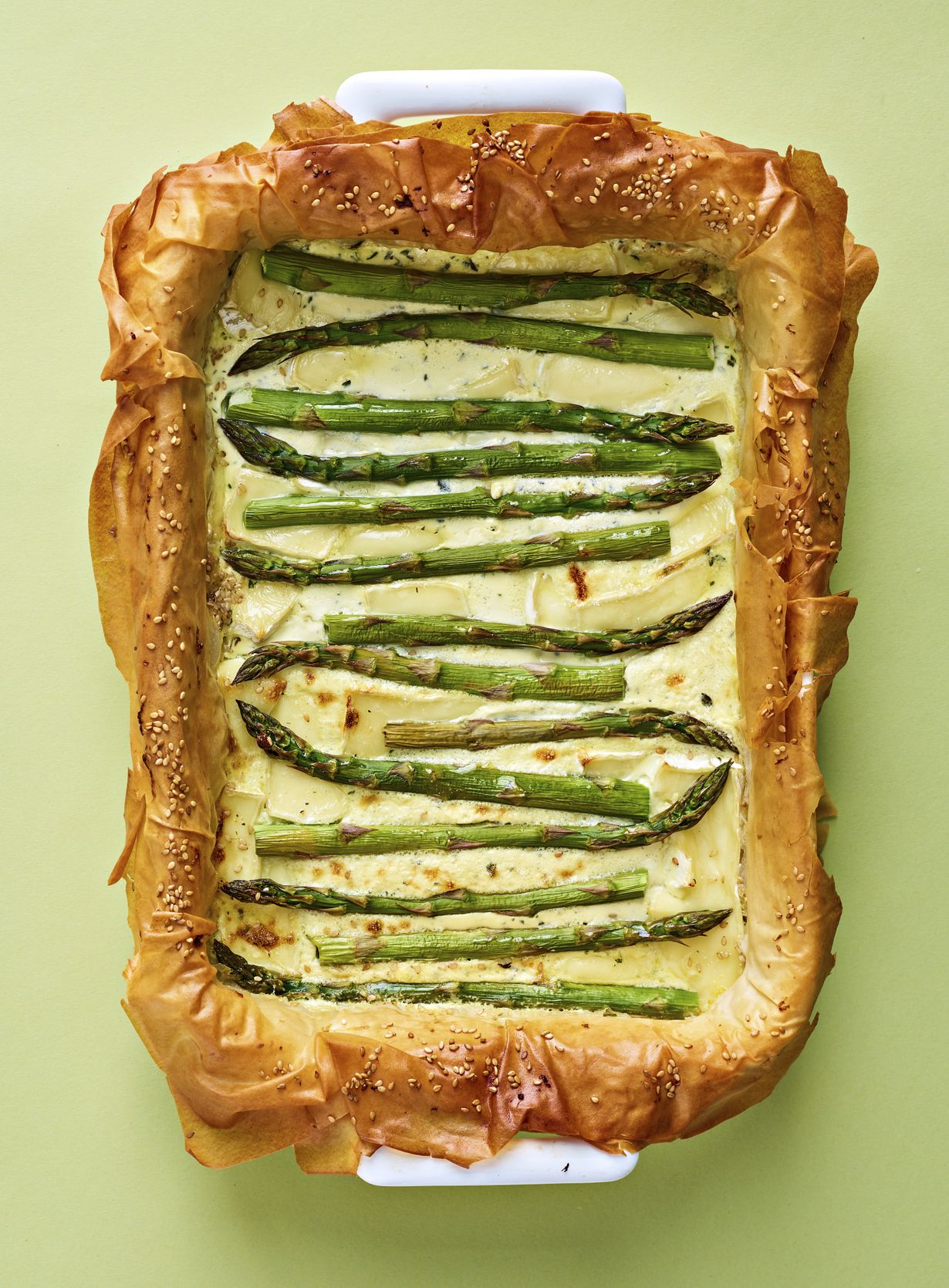- Napsauta parsoista puumainen varrenosa pois. Kaada ranskankerma-munatäyte taikinalevyjen päälle. Lado brie-siivut tasaisesti täytteen päälle. Asettele parsat riviin juuston päälle. Paista 25 minuuttia uunin keskitasolla.