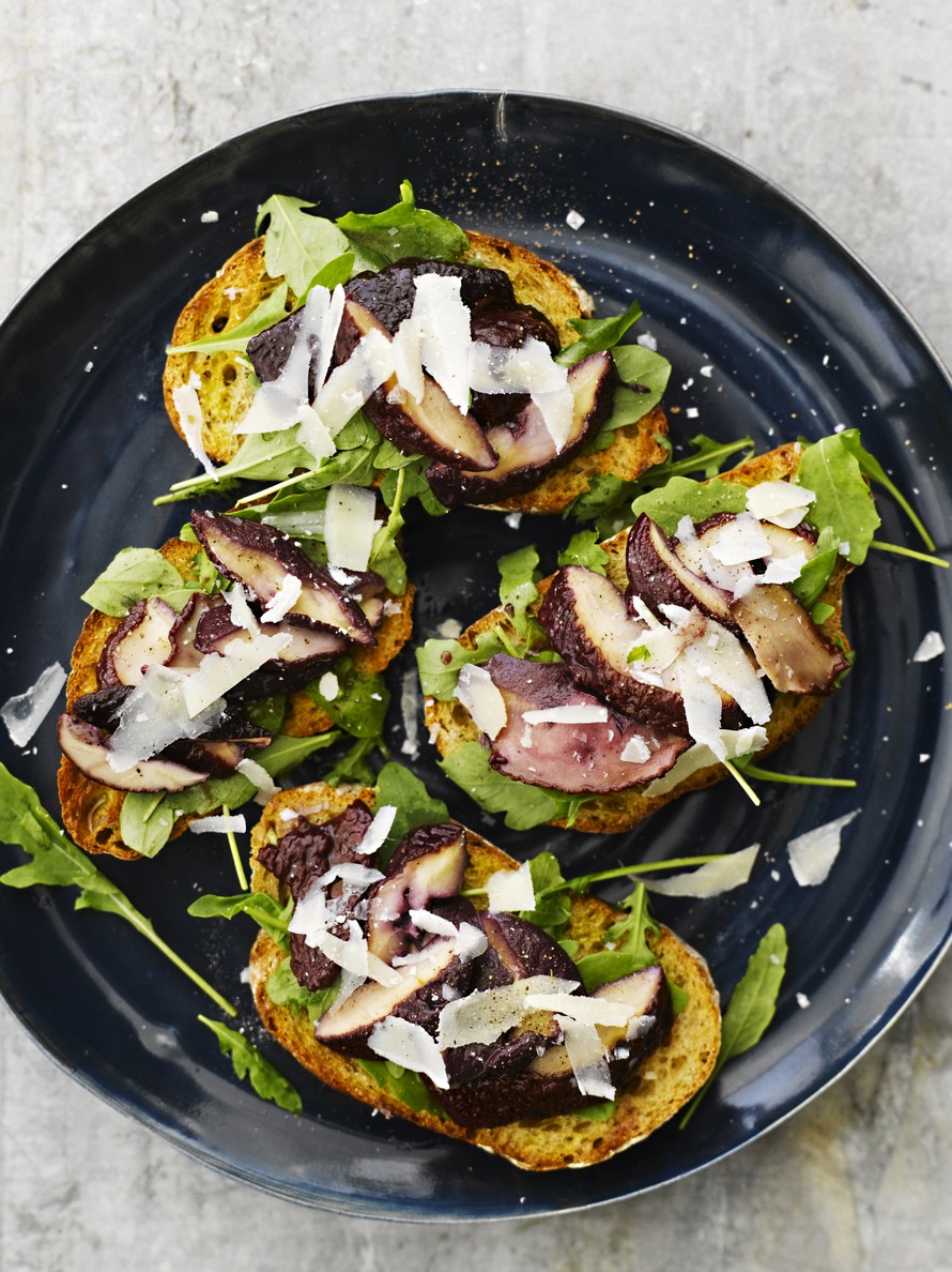 - Viipaloi tattien lakit. Paahda leipäviipaleet. Ripottele leivälle öljyä, rucolaa ja tatit. Raasta päälle parmesaania.
