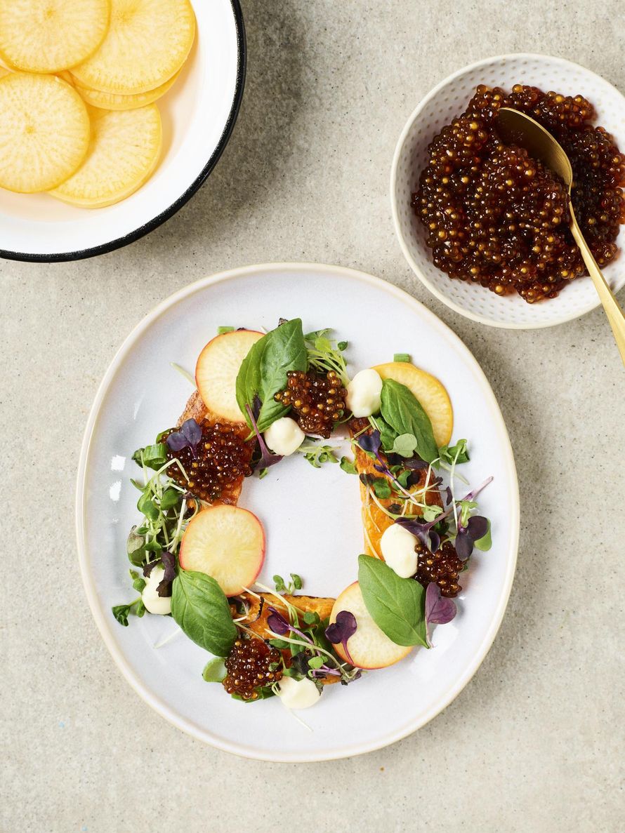 Nauriiden kanssa maistuu suolainen vegekaviaari, joka on tehty soijakstikkeessa marinoiduista tapiokahelmistä.