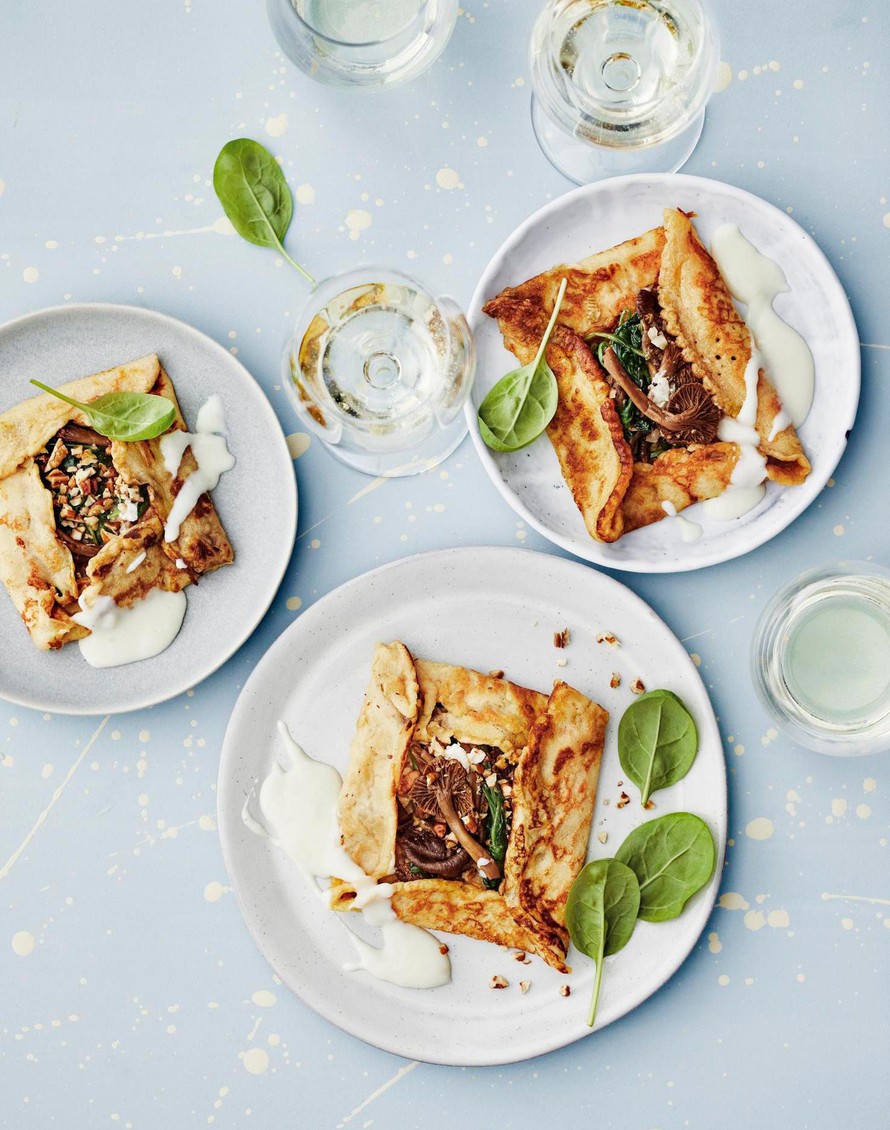 Aikuisten lettukestit! Kreppien täytteessä maistuvat nyt paistetut sienet, kermainen vuohenjuusto ja pinaatti. Viimeistele herkku lempeänmakuisella ja samettisen pehmeällä valkokastikkeella.