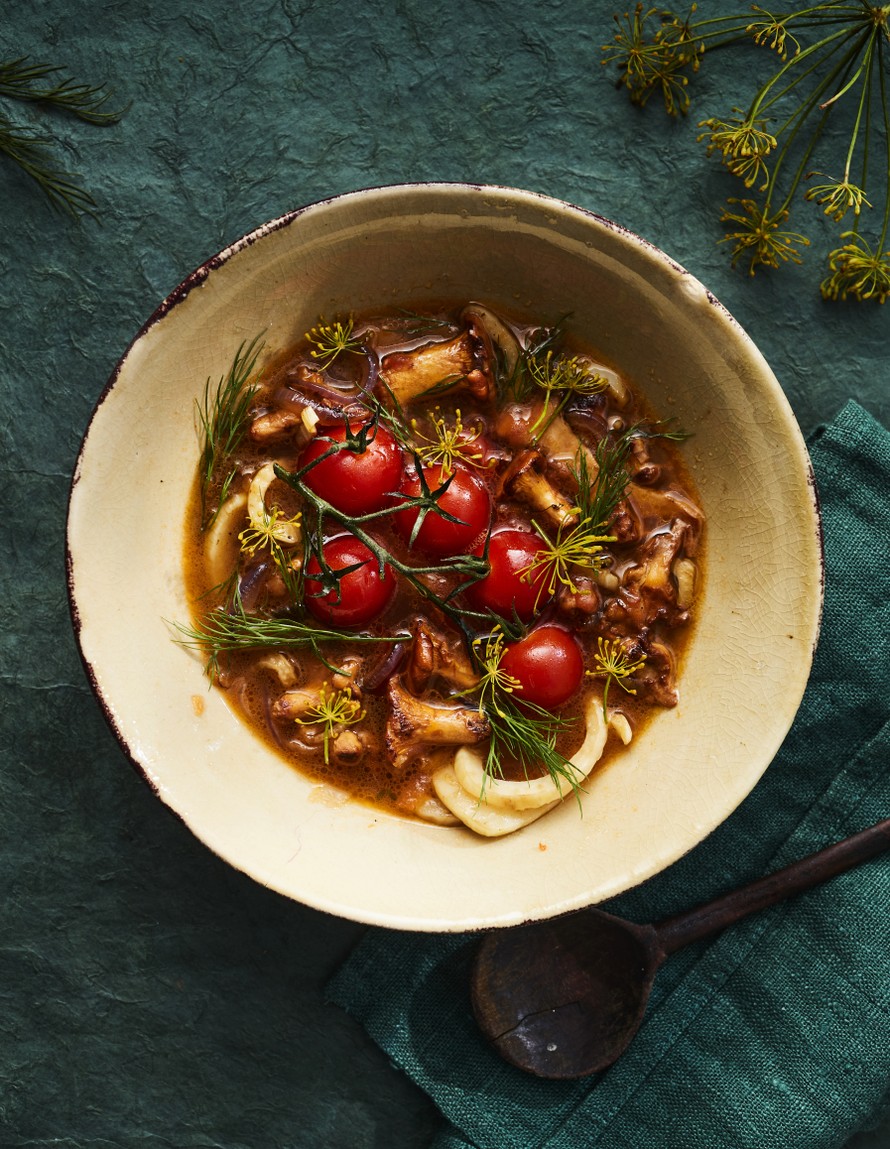 - Puhdista loput kantarellit, pilko isommat muutamaan osaan, jätä pienet kokonaisiksi. Kuori ja suikaloi sipuli, hienonna fenkoli. Halkaise kirsikkatomaatit. Hienonna tilli.