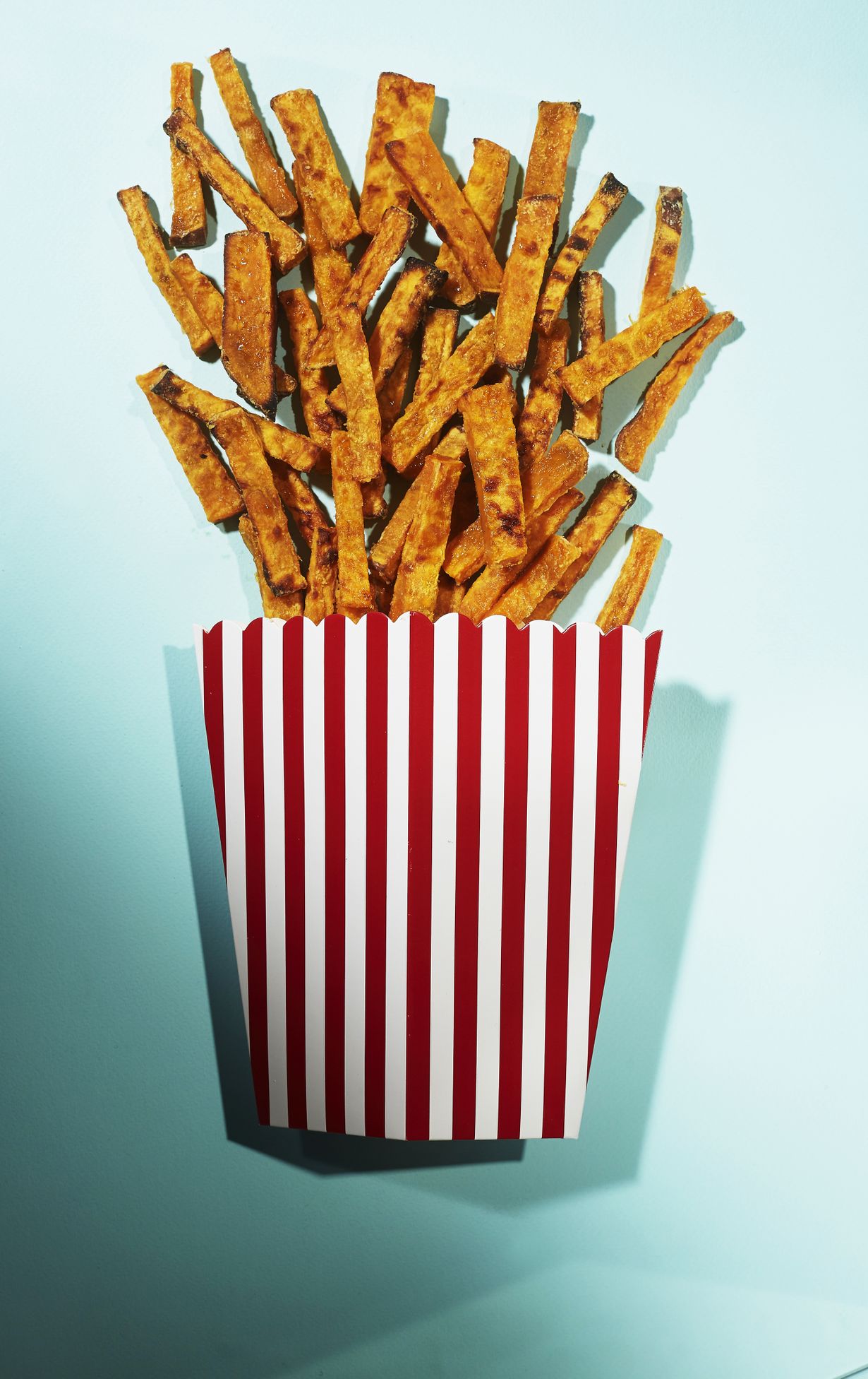 - Kuumenna uuni 225-asteiseksi. Kuori bataatit ja leikkaa ranskalaisia muistuttaviksi tikuiksi.