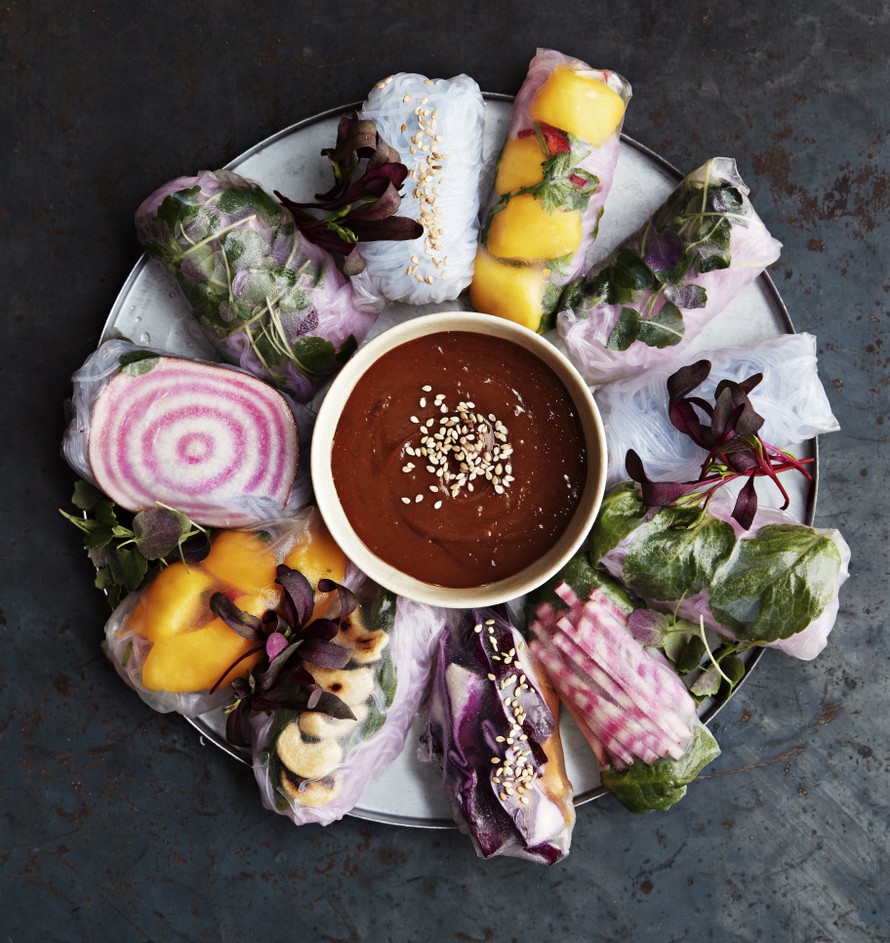 - Täytä suuri kulho vedellä. Kasta yksi riisipaperiarkki kerrallaan noin 10 sekunniksi veteen. Laita pehmennyt paperi varovasti lautaselle. Lisää haluamiasi täytteitä riisipaperin keskelle. Taita paperin reunat täytteen päälle ja rullaa nyytti tiukaksi. Valmiit rullat tarttuvat helposti toisiinsa eli asettele ne lautaselle hieman irti toisistaan. Tarjoa rullat maapähkinäkastikkeen kanssa.