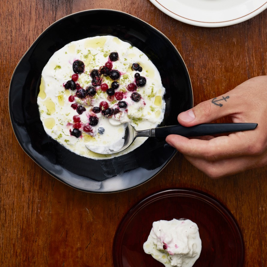 Tämä alkupala on ihanan helppo tehdä: revi mozzarella ranskankerman joukkoon, laita päälle herukoita ja viimeistele oliiviöljyllä ja itse tehdyllä kuusisuolalla.