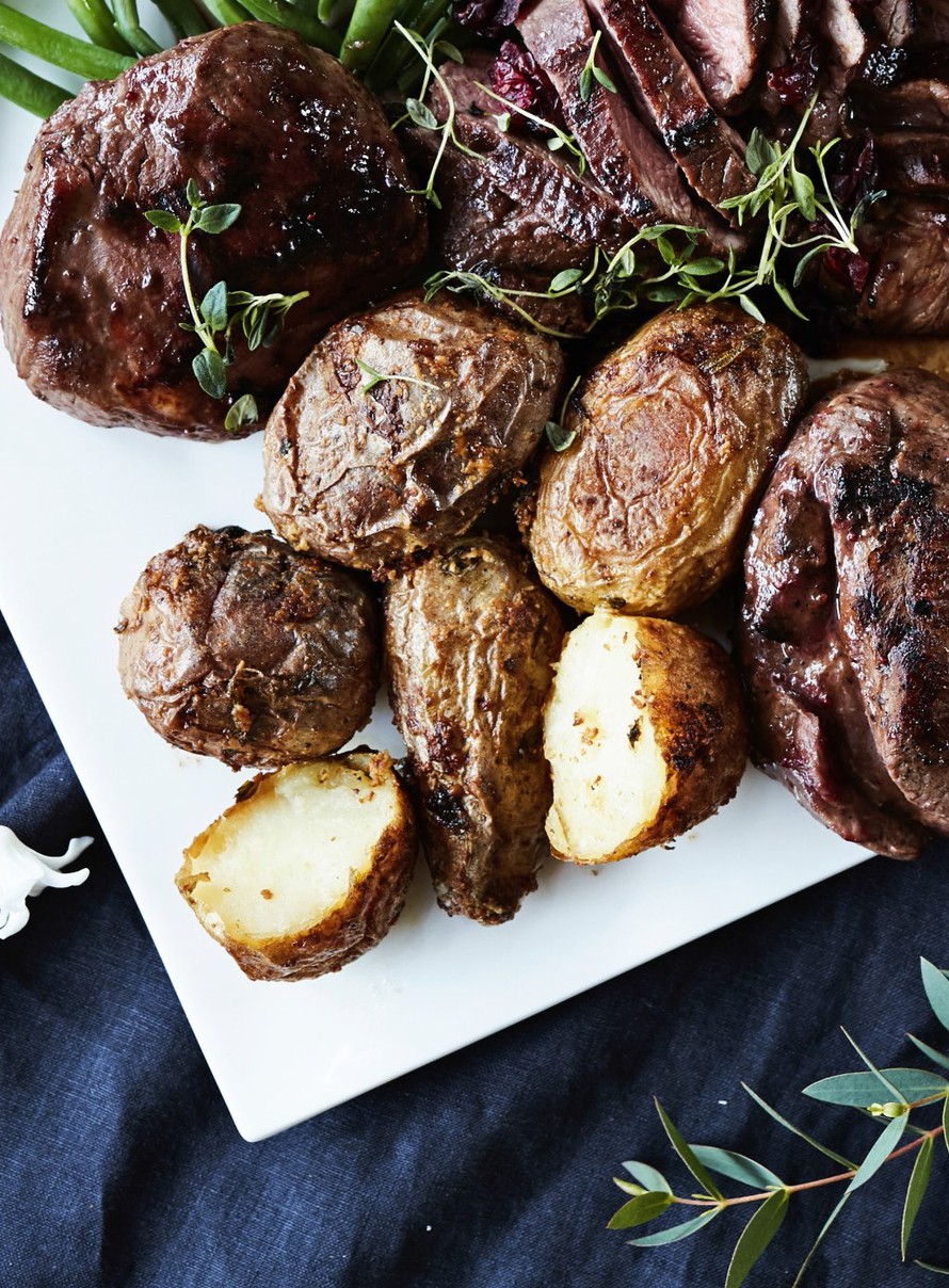 - Sekoita käsin voi, yrtit, parmesaani ja suola. Lisää vuokaan perunat ja hiero seos niiden pintaan. Pistä haarukalla perunoihin muutama reikä. Paahda tunti uunissa. Kääntele välillä mausteissa. Lisää voita tai öljyä pintaan, jos ne tuntuvat kuivilta.