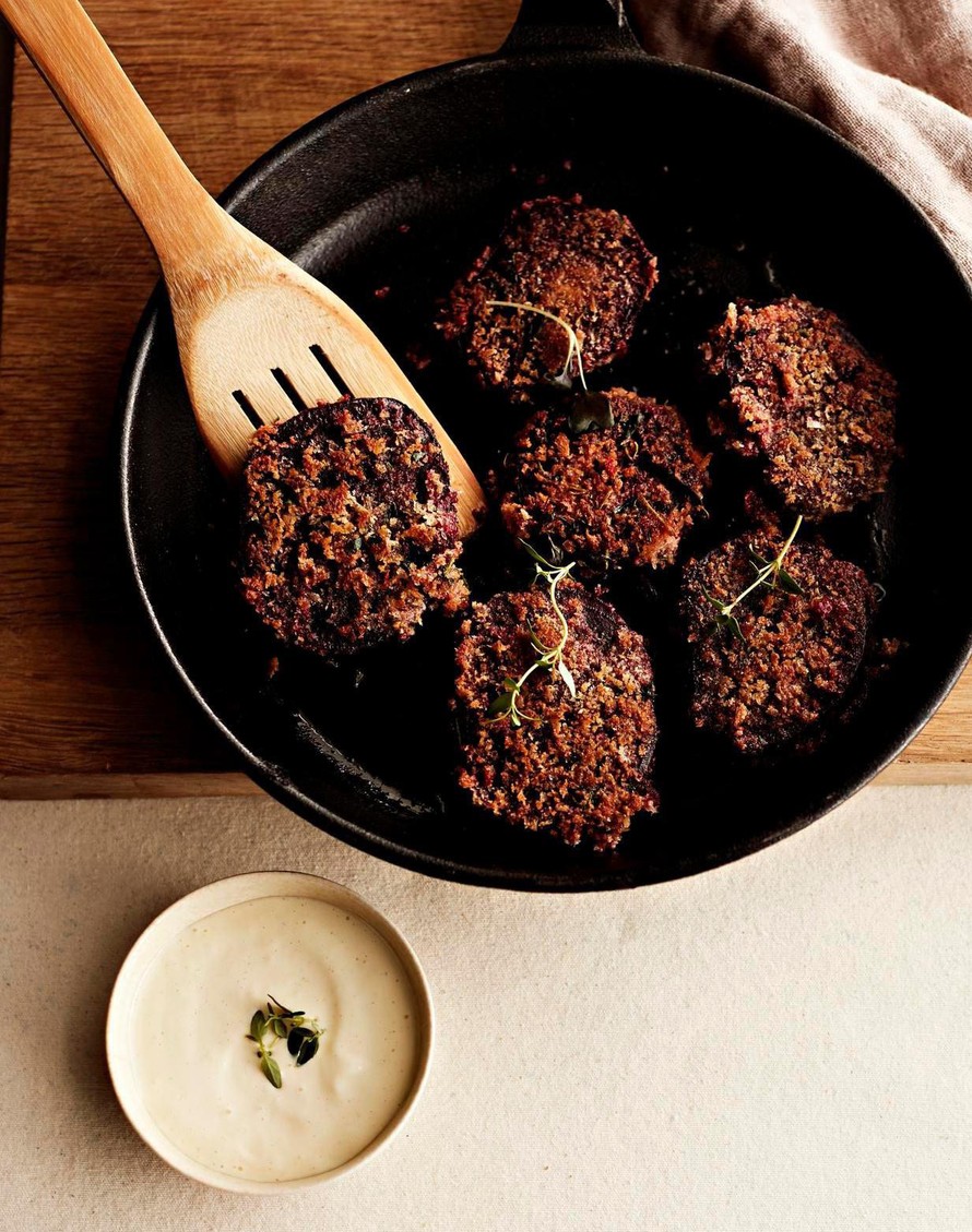 Pyörittele punajuurikiekot ensin kananmunassa, sitten yrtti-pankojauhosekoitukses sa. Paista oliiviöljyssä rapeiksi ja nauti kuumana aiolin kanssa.