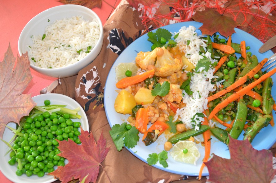 Siivuta valmiiksi seesamisokeriherneitä varten kevätsipulit ja porkkana ohuiksi pieniksi suikaleiksi ja hienonna tuoretta inkivääriä jakamalla se salaattiin ja curry kasvispataa varten. Ota sokeriherneet pakasteesta ja irrota palosta herneet mikäli ne ovat siinä ja säästä aterian koristeluun. Itse palot tulevat sokeriherneinä seesamiliemeen. Hienonna punasipuli ja valkosipulinkynnet. Esikypsennä perunat ja kukkakaali kattilassa vain vähän aikaa. Kuori perunat ja paloittele isoiksi paloiksi kukkakaali. Kuori myös porkkanat ja suikaloi ne. Kuumenna kasari johon laitat paistoöljyn ja sinne punasipulin kuullottumaan. Sekoita hyvin ja anna hieman rusehtua. Lisää kasariin hienonnettu valkosipuli ja tuore inkivääri. Kuullota vielä ja lisää sitten korianteri mauste, juustokumina, kurkuma- mauste, cayanne mauste ja tomaattipyrée. Sekoita hyvin ja lisää kasvisliemi 5dl mukaan johon laitat 2 kasvisliemikuutiota ja myös kookosmaidon. Anna keittyä 10 minuuttia hiljalleen kannen alla. Laita kattilaan vesi kiehumaan ja lisää haluttu määrä pikäjyväistä riisiä keittymään 20 minuutiksi. Lisää puolestaan pataan juuri esikypsennetyt perunat ja kukkakaali pienempinä paloina ja porkkanat siivuina sekä tomaatit paloina. Anna hautua 10 minuuttia ja lisää sitten kikherneet. Hauduta 10 minuuttia lisää. Lisää lopuksi pinaatti, paloitellut limehedelmät. Anna olla ja tee vielä seesamisokeriherneet toisessa kasarissa; laita 2 rkl kasviöljyä pannulle ja anna kuumentua keskilämmölle kunnes lisäät seesaminsiemenet, varo siementen roiskumista, pata ei voi olla täysin vielä korkeimmalla kuumuudella, lisää sokeriherneen palot mukaan kun lisäät kuumuutta ja sekoittele porkkanasiivut, kevätsipulisiivut ja inkivääri mukaan. Myös seesamiöljy on syytä lisätä tässä vaiheessa freesausta. Pidä vihannekset jatkuvasti liikkeessä ja lisää mukaan soijakastike.