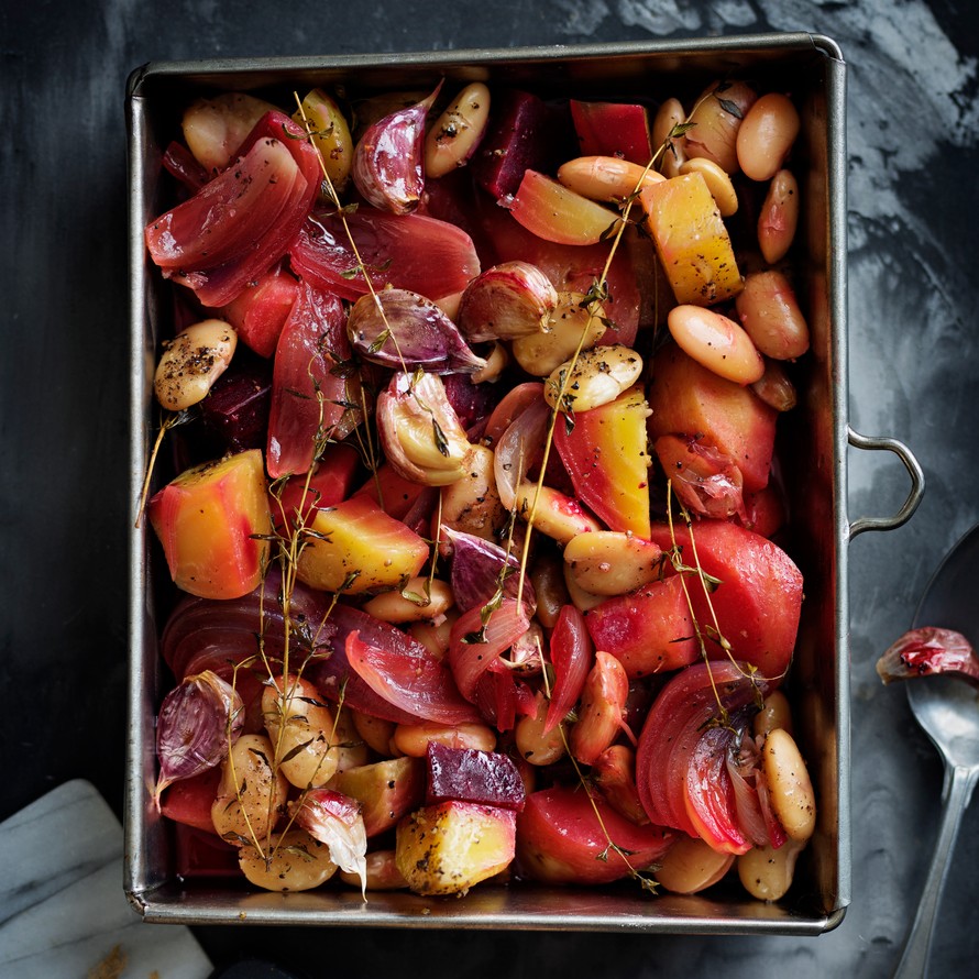 Kasvisruokaillan tunnelmanluojaksi valmistuu helppo 40 kynnen juures-papupata, joka on mukaelma brittiläisen tv-kokin Nigella Lawsonin kuuluisasta 40 kynnen kanapadasta.