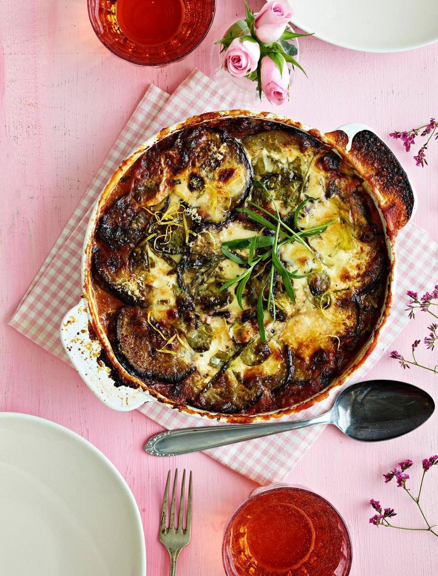 Paista melanzanea uunin keskitasolla 40–45 minuuttia. Anna levätä ennen tarjoilua. Koristele valmis ruoka raastetulla sitruunankuorella ja tuoreilla yrteillä.
