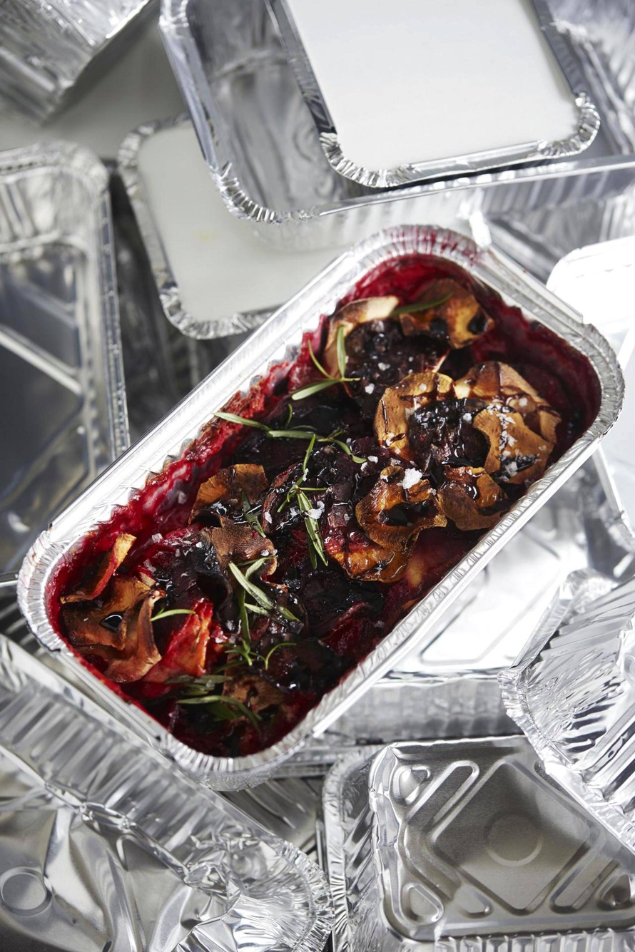 Joulupöydän tyylikkäin vuoka kasataan juureslastuista. Makean punajuuren, bataatin ja pähkinäisen palsternakan maut sopivat täydelisesti yhteen. Piparjuurituorejuusto tuo lempeää makua kerrosten väliin.