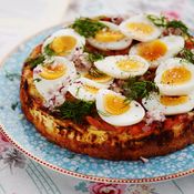 Voitele pieni uunivuoka (vetoisuus 1–1,5 l). Kaada seos vuokaan ja tasoita pinta. Ripottele päälle korppujauhot ja paina lusikan kärjellä pintaan kuvioita. Lisää muutama voinokare.