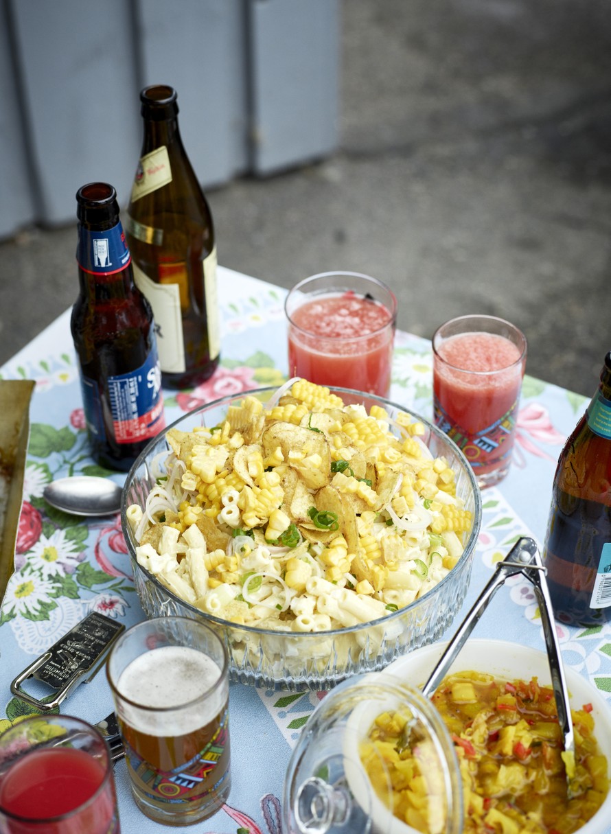 Salaatti on suunniteltu lisukkeeksi piknikille, mutta se sopii mainiosti myös illanistujaisiin. Ideana on sekoittaa kunnolla maustunut pasta tasaiseksi, kumota se kulhoon ja viimeistellä juuri ennen tarjoilua maissilla ja kevätsipulilla.