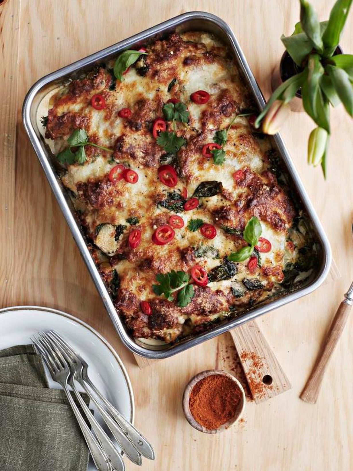 Paista uunin keskitasolla 30–40 minuuttia. Anna lasagnen vetäytyä hetki ennen tarjoilua. Koristele halutessasi yrteillä ja chilillä.