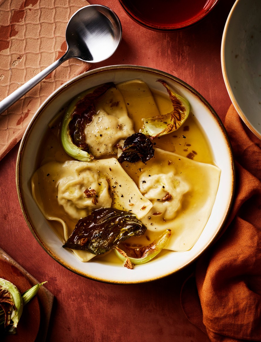 Juustoiset kukkakaaliraviolit tarjotaan aromaattisen liemen kanssa.