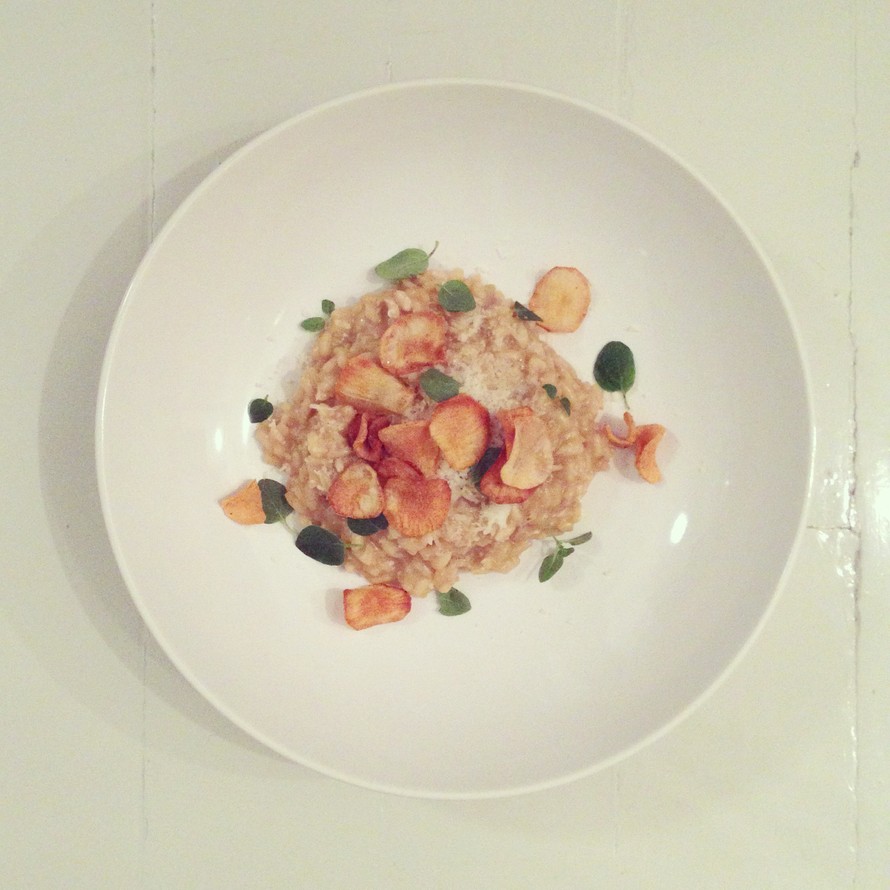 Risotto on ylistys maa-artisokalle, sillä siihen käytetään paahdettua maa-artisokkapyreetä ja pinnalle ripotellaan rapeita itse tehtyjä sipsejä. Ruuan teko on helppoa, mutta aikaa se vaatii. Lupaamme, että maku palkitsee.