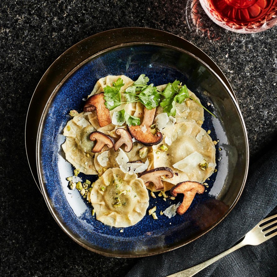 Keitä ravioleja suolavedessä (1 tl suolaa/ 1 l vettä) 2–3 minuuttia. Valuta ja jaa lautasille. Lisää sienet ja pistaasirouhe. Vuole pecorinolastuja pinnalle.