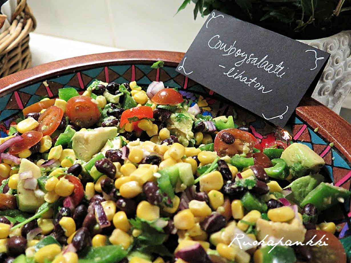 Cowboysalaatti, on taattua tex mex settiä. Tämä värikylläinen salaatti sopii mahtavasti myös noutopöydän antimeksi, grillipihvien ja -kanan lisukkeena. Voit myös tuunata salaattia vielä ruokaisemmaksi lisäämällä lisää proteiinia joukkoon. Salaatti on maidoton, lihaton ja gluteeniton.
