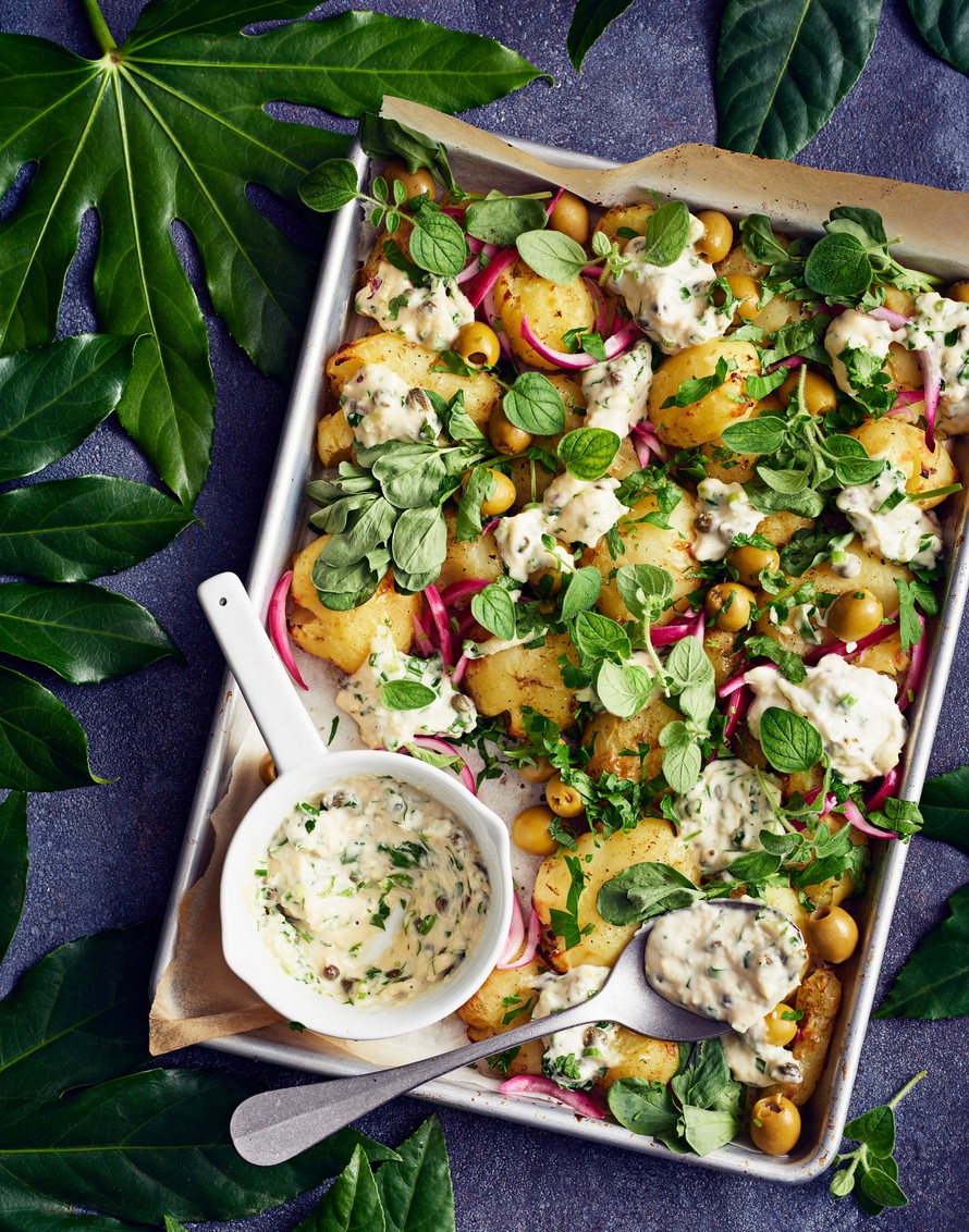 - Lusikoi perunoille kastiketta. Viimeistele lopuilla yrteillä.