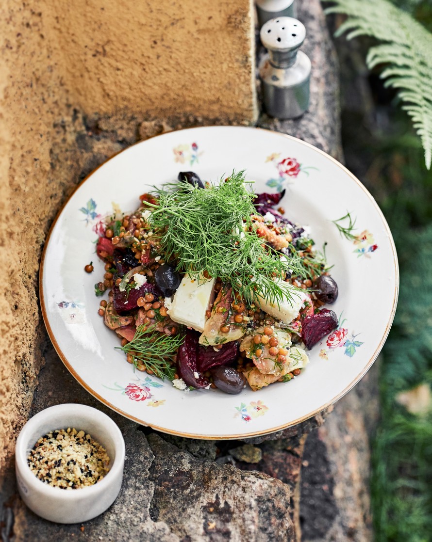 Huuhtele ja valuta linssit siivilässä. Hienonna tilli. Sekoita punajuuret, linssit, tilli ja kastike. Murustele feta ja ripota dukkah pinnalle.