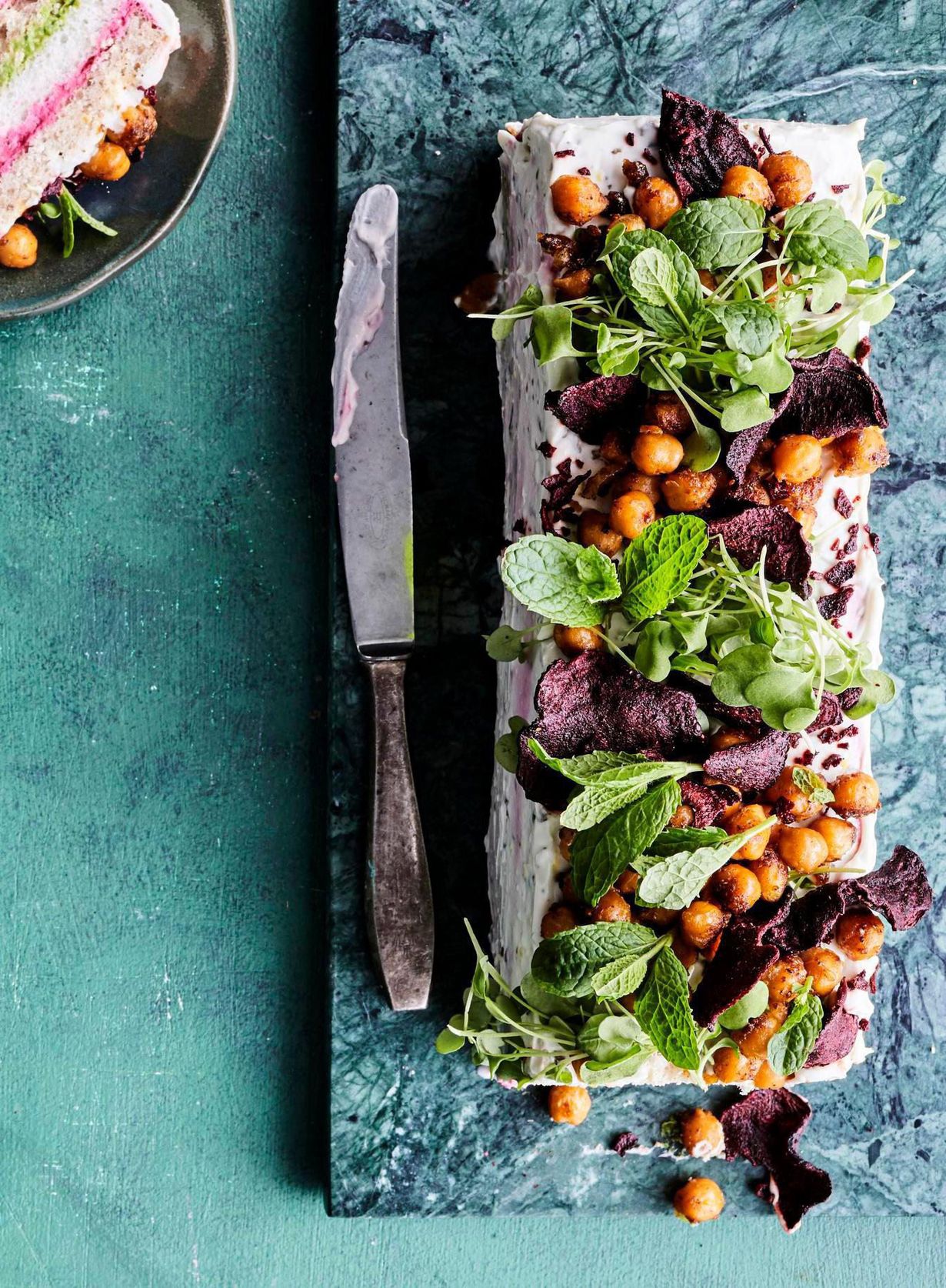 Vegaanisen voileipäkakun täytteenä on avokado-hernetahnaa ja valmista punajuurihummusta. Paahdetut mausteiset kikherneet ja juuressipsit tuovat makua ja rapeutta.