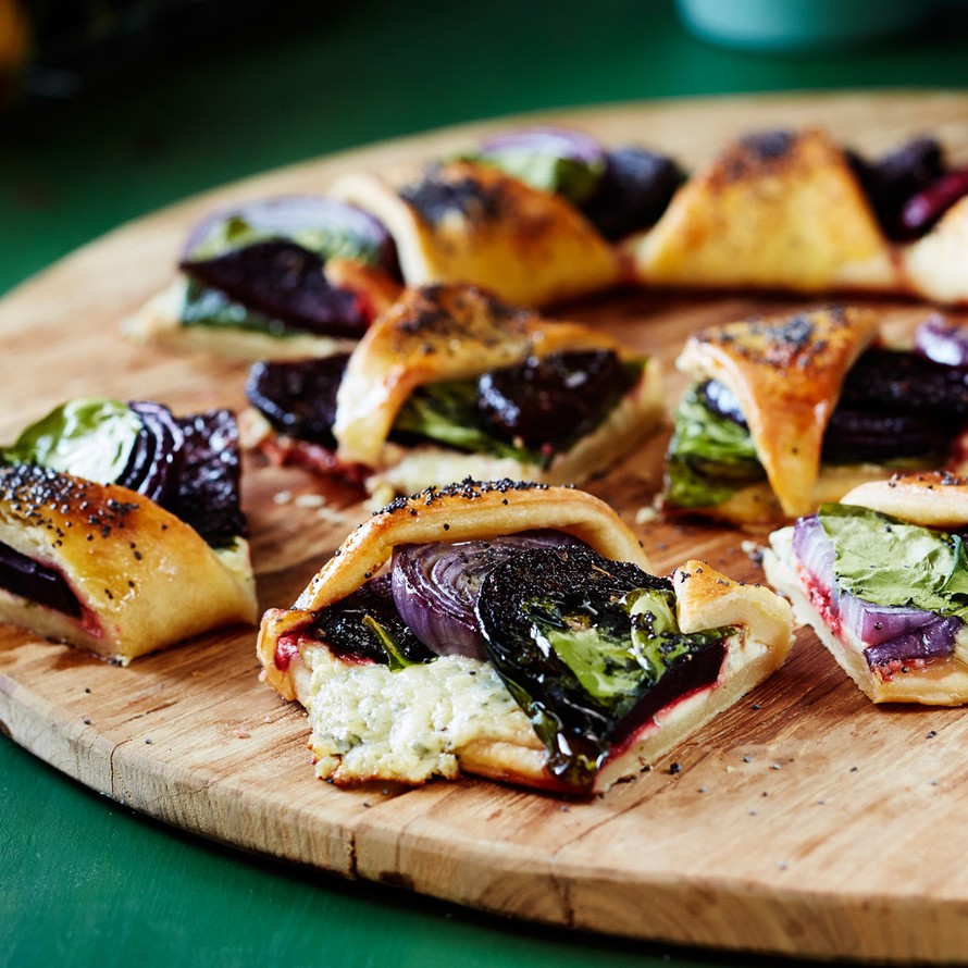 - Kauli taikina jauhotetulla työtasolla halkaisijaltaan noin 35 cm pyöreäksi levyksi. Siisti levyn reuna taikinapyörällä tai pizzaleikkurilla. Nosta levy leivinpaperin päälle uunipellille. Leikkaa levyn keskelle neljä ristikkäistä viiltoa. Levitä homejuustotahna levyn ulkoreunalle. Asettele tahnan päälle lomittain paahdettuja hieman jäähtyneitä punajuuria, sipulirenkaita ja pinaatinlehtinippuja. Kun täytteet kiertävät koko levyn ympäri, käännä keskelle muodostuneet kolmion muotoiset siivekkeet täytteen päälle. Nipistele kiinni reunaan.