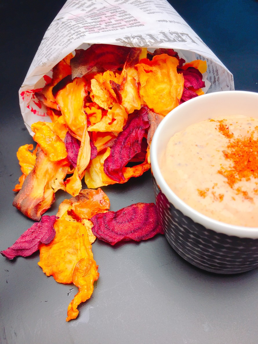 Luomujuureksista valmistat värikkäät ja maukkaat sipsit uunissa. Mandoliinin avulla siivutat juureksista tarpeeksi ohuita. Seuraksi sopii tulinen dippikastike. Dipin pohjana on suomalaisesta luomukaurasta valmistettu ranskankerma, joten nämä naposteltavat maistuvat myös maitoallergiselle ja vegaanille.
