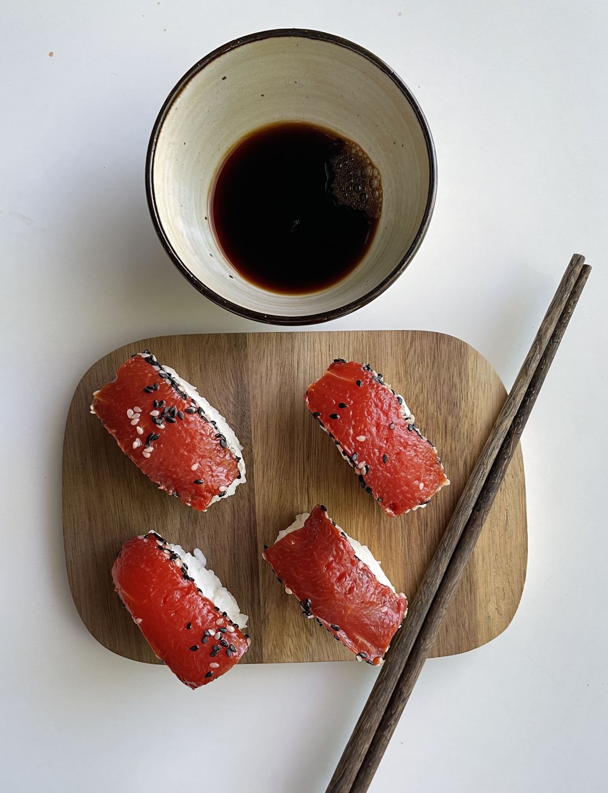 Kun vesimelonin marinoi soijassa, seesamiöljyssä ja norilevässä, saa aikaan tonnikalaa muistuttavan sushi- tai sashimiherkun. Ohje on todella helppo, mutta marinointi vaatii aikaa.