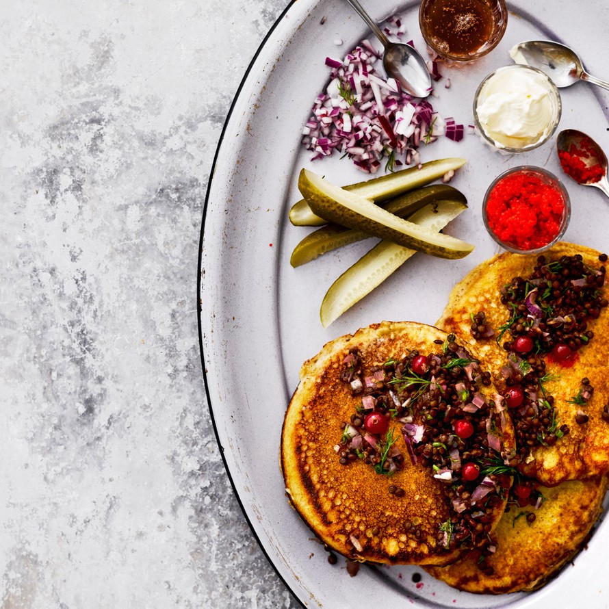 Mäti on blinien perinteinen seuralainen. Tässä ohjeessa kaviaari valmistetaan beluga-linsseistä.