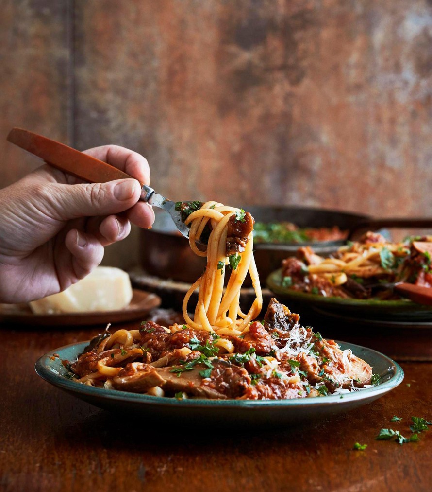 Leikkaa padan päälle leivinpaperista pyöreä kansi ja palan keskelle pieni reikä. Paina leivinpaperikansi kastikkeen pinnalle. Hauduta kastiketta uunissa 1½ tuntia. Sekoita valmiiseen kastikkeeseen juustoraaste ja koristele annokset hienonnetulla persiljalla. Tarjoile pastan kanssa.