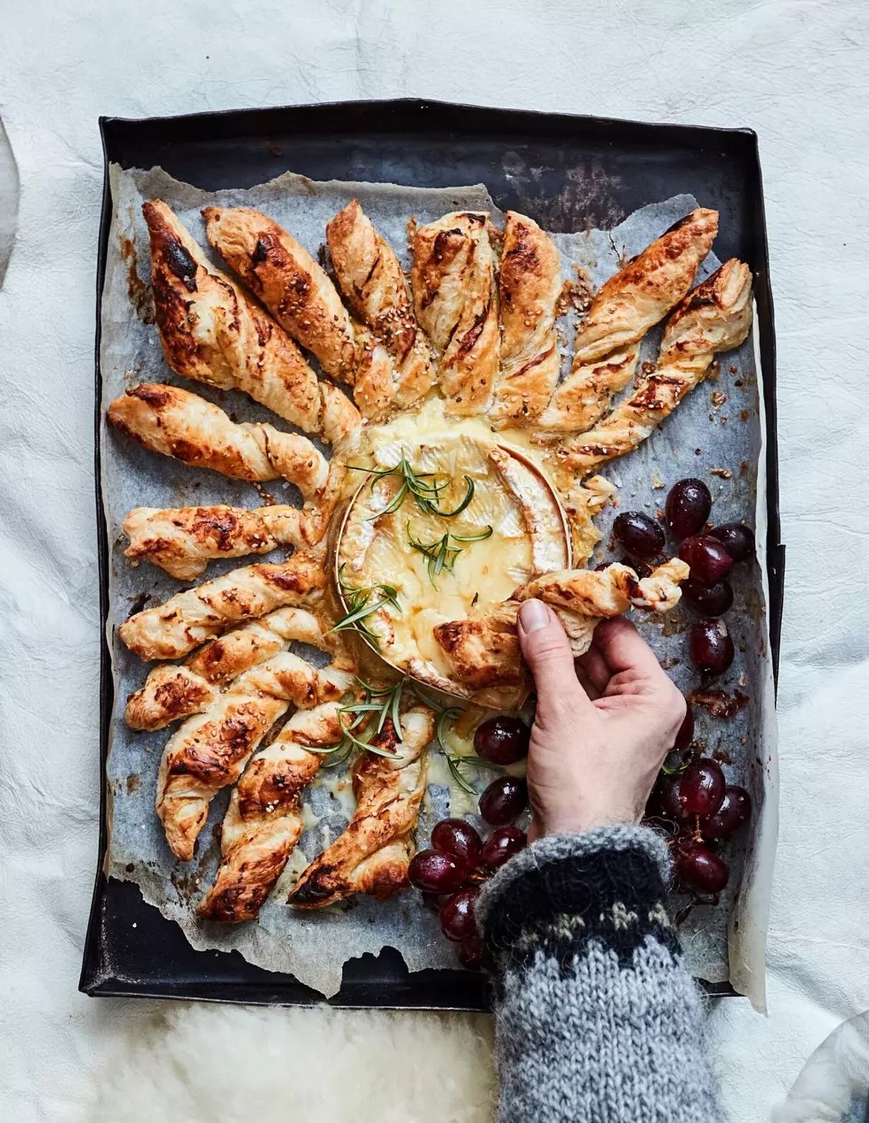 Jos et ole vielä kokeillut paistettuja, balsamicolla maustettuja viinirypäleitä, tee se nyt. Rapeat lehtitaikinakierteet ja Camembert-dippi viimeistelevät tämän herkun.