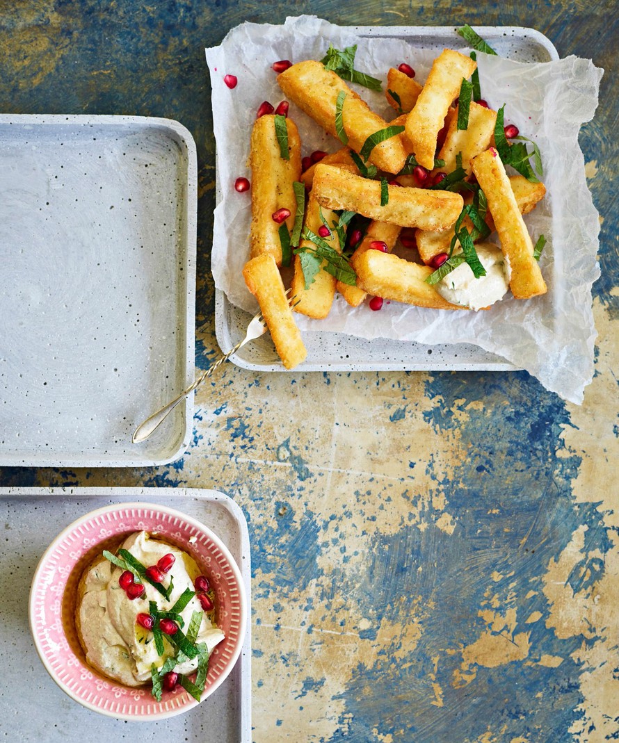 - Kuivaa halloumin pinta. Leikkaa halloumi tikuiksi. Sekoita lautasella jauho ja mausteet. Pyöritä halloumi-tikut erissä jauhossa.