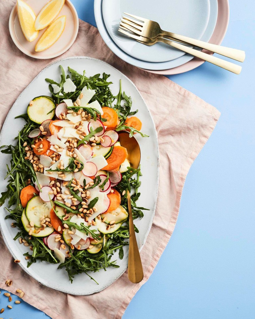 - Kokoa carpaccio juuri ennen tarjoilua. Levitä rucolaa tarjoiluvadille ja lisää kasvikset. Viimeistele parmesaanilla ja pinjansiemenillä.