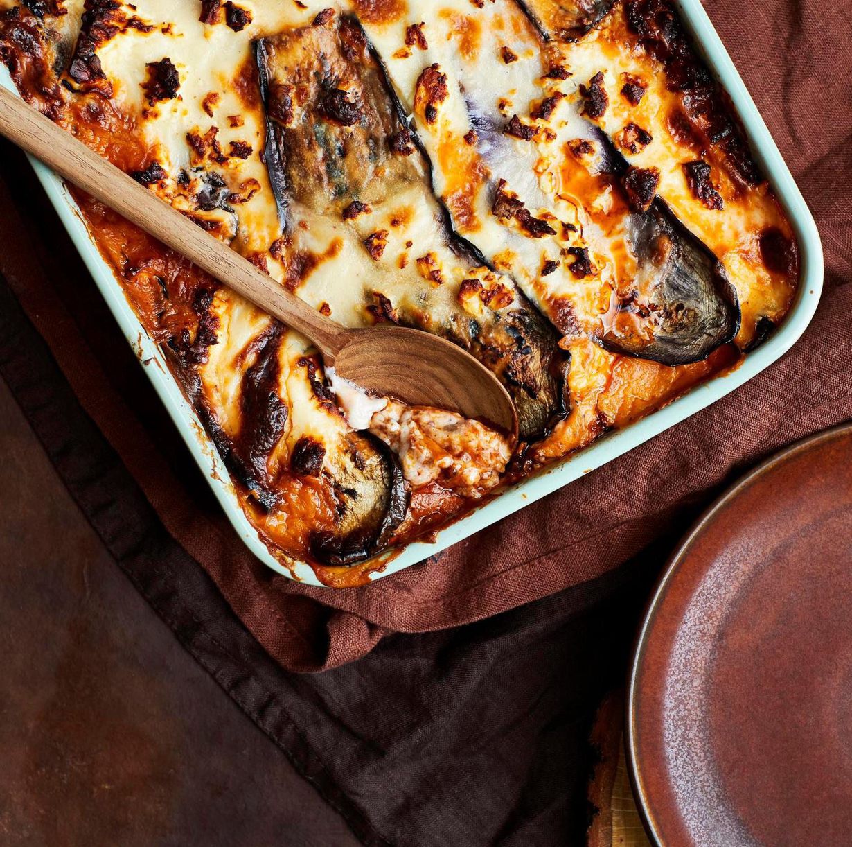 Kypsennä moussakaa 200-asteisen uunin keskitasolla noin 40 minuuttia. Jos pinta alkaa ruskistua liikaa, peitä vuoka foliolla. Anna vetäytyä vähintään puoli tuntia ennen tarjoilua.