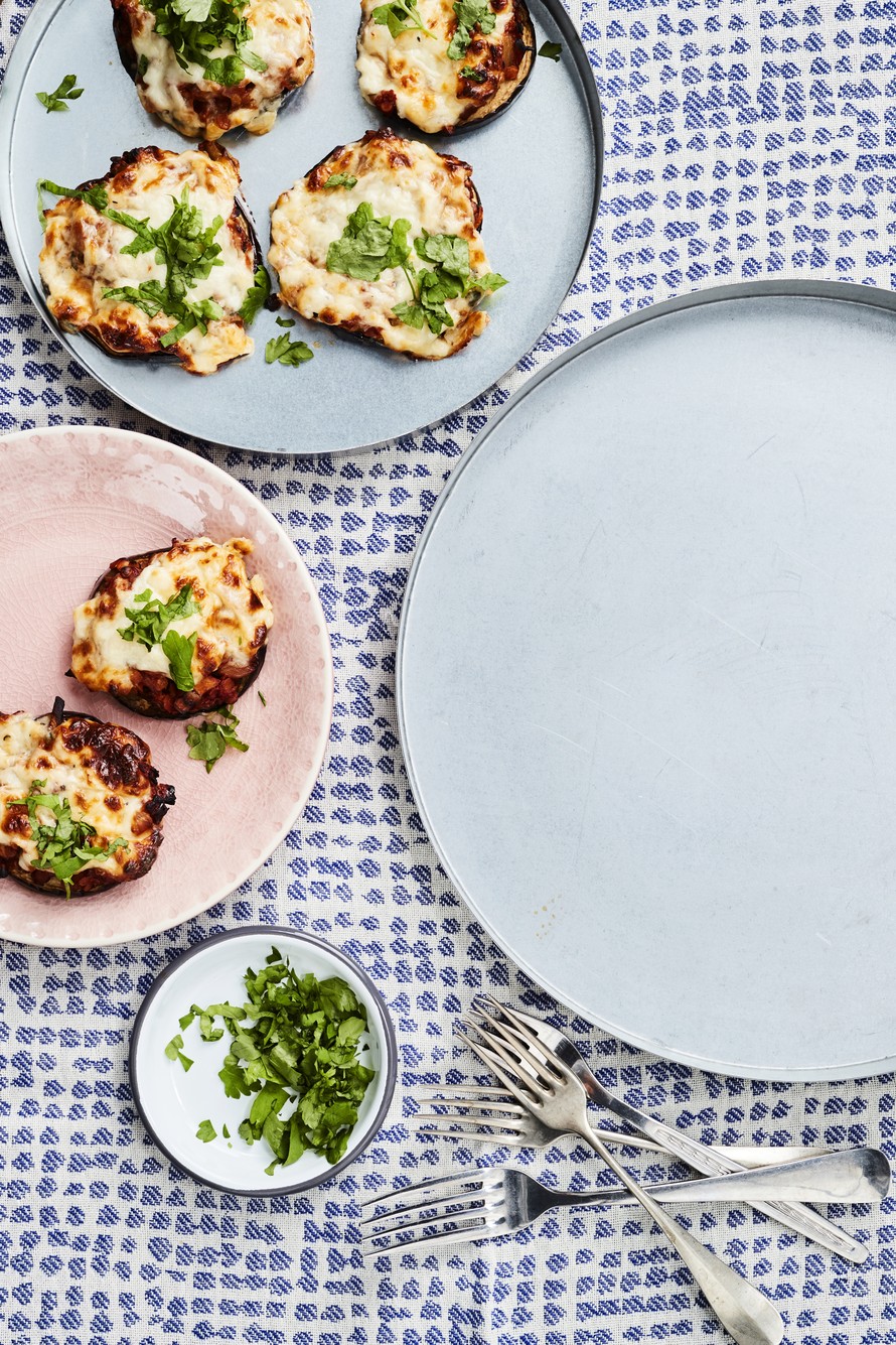 Yksittäiset munakoisojen päälle kootut moussakat ovat kuin pikkuisia pizzoja. Tarjoa niiden kanssa raikasta salaattia.