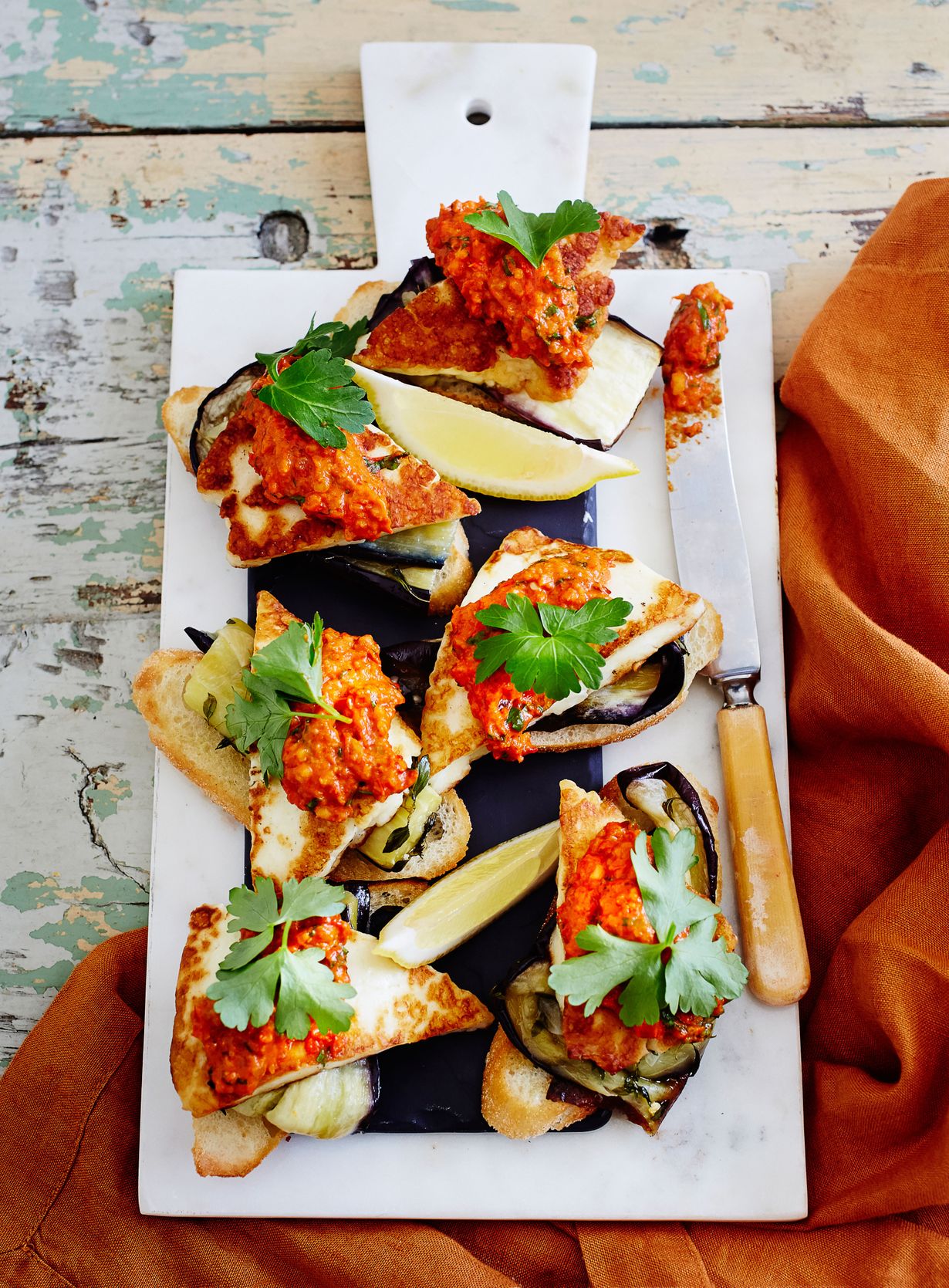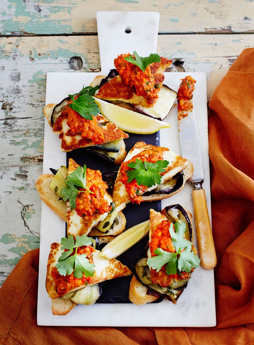 - Kokoa pintxot. Laita leivälle munakoisopala ja sen päälle halloumiviipala ja lusikallinen romescoa. Hienonna päälle persiljaa ja tarjoa sitruunalohkojen kanssa.