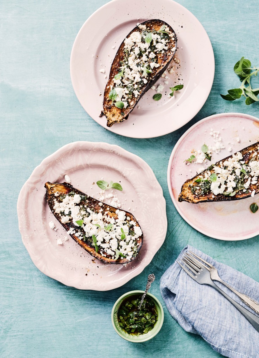 Valuta vinegretti kuumille munakoisoille ja anna maustua 10 minuuttia. Murenna fetajuusto päälle ja viimeistele oreganonlehdillä.