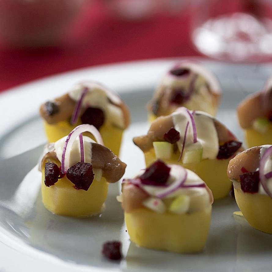 - Leikkaa punajuuri, maustekurkku ja omena hyvin pieniksi kuutioiksi. Asettele jokaiselle perunalle viipale silliä ja punajuurta, maustekurkkua ja omenaa.