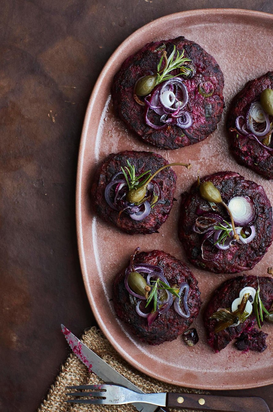 Keitä perunat kypsiksi, jäähdytä ja raasta kypsät perunat. Kuori ja raasta punajuuret, raasta tai hienonna sipuli. Sekoita raasteet sienien joukkoon, riko mukaan muna ja lisää korppujauhot. Mausta hienonnetulla rosmariinilla, suolalla, jauhetulla maustepipurilla. Sekoita tasaiseksi massaksi ja anna maustua jääkaapissa vähintään 30 minuuttia. Paista taikinasta pannulla öljyssä pieni testipala. Jos pihvi ei pysy paistaessa kasassa, lisää taikinaan korppujauhoja.